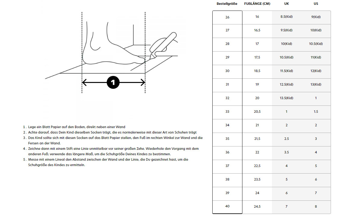 Größentabelle **Diese Sneaker werden in UK-Größen ausgezeichnet!**